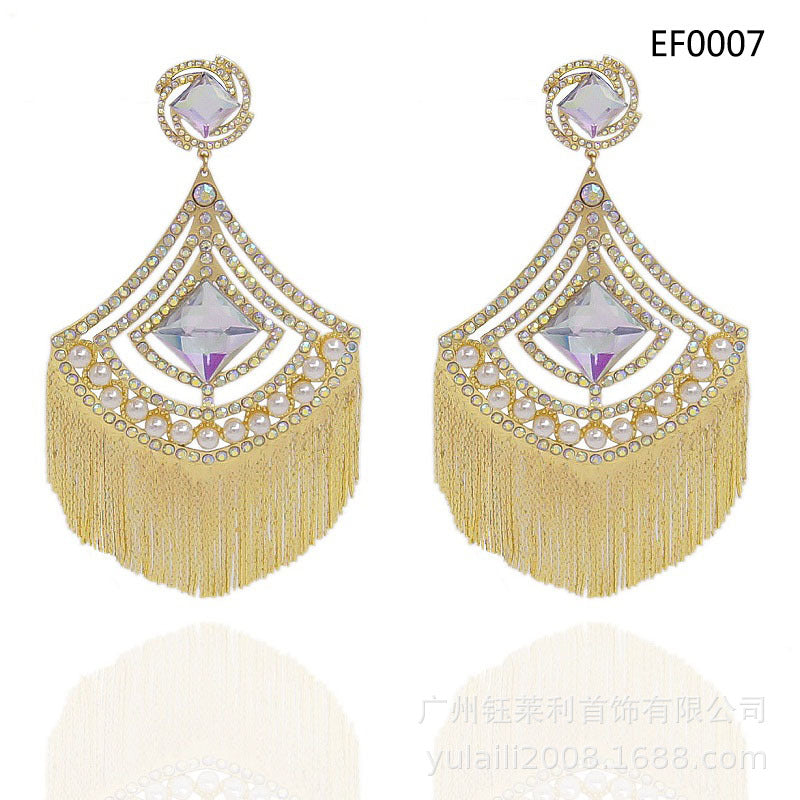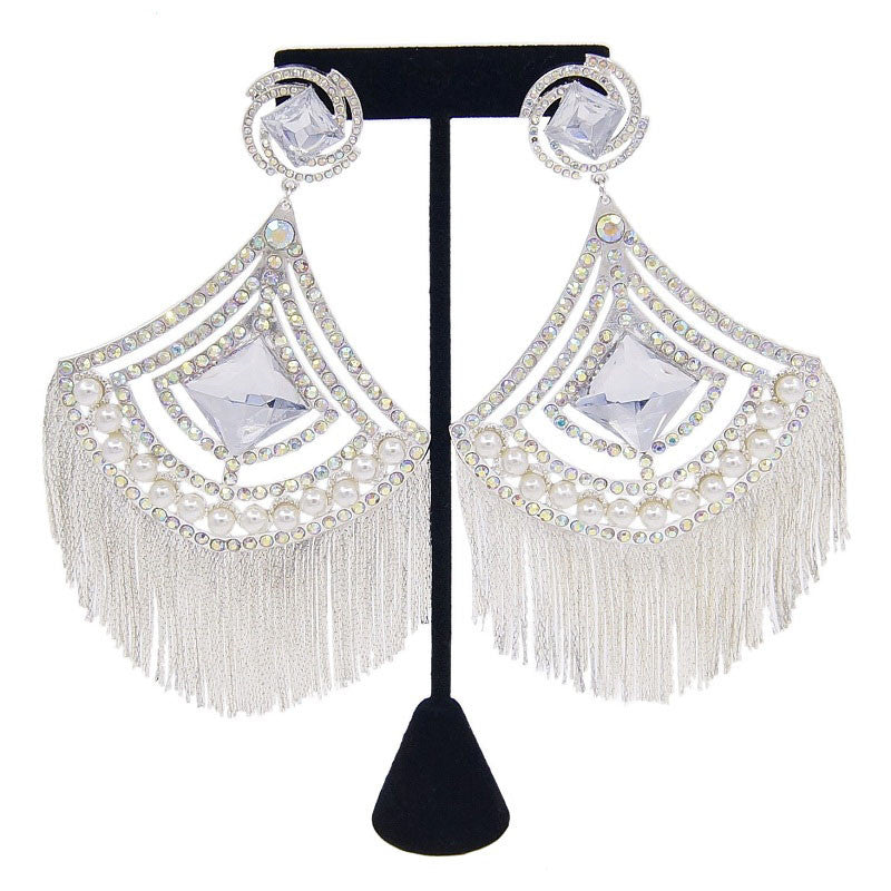 24K Gold-Plated Luxury Diamond Pearl Tassel Long Earrings Fashion Personality Exaggerated Pendant Large Earrings Bridal Earrings