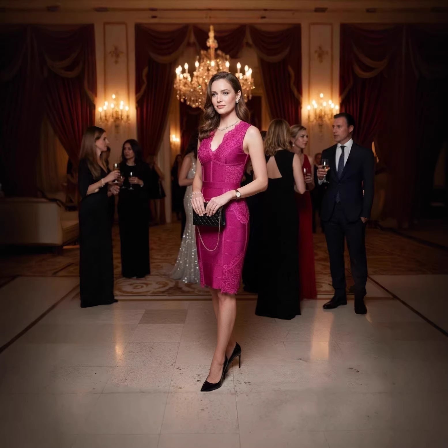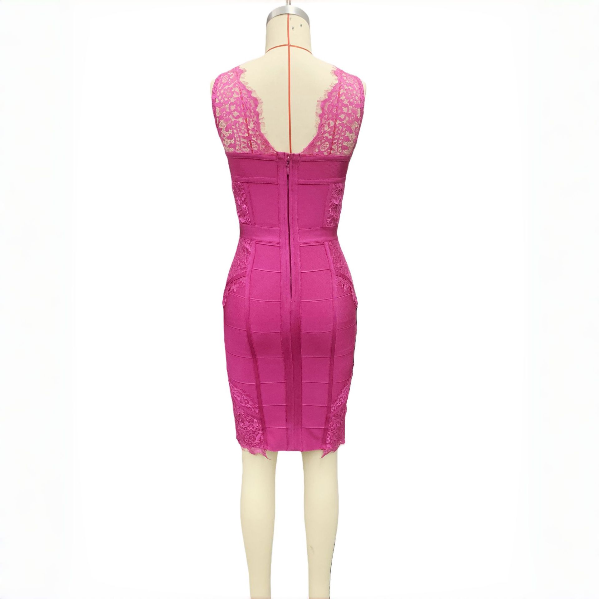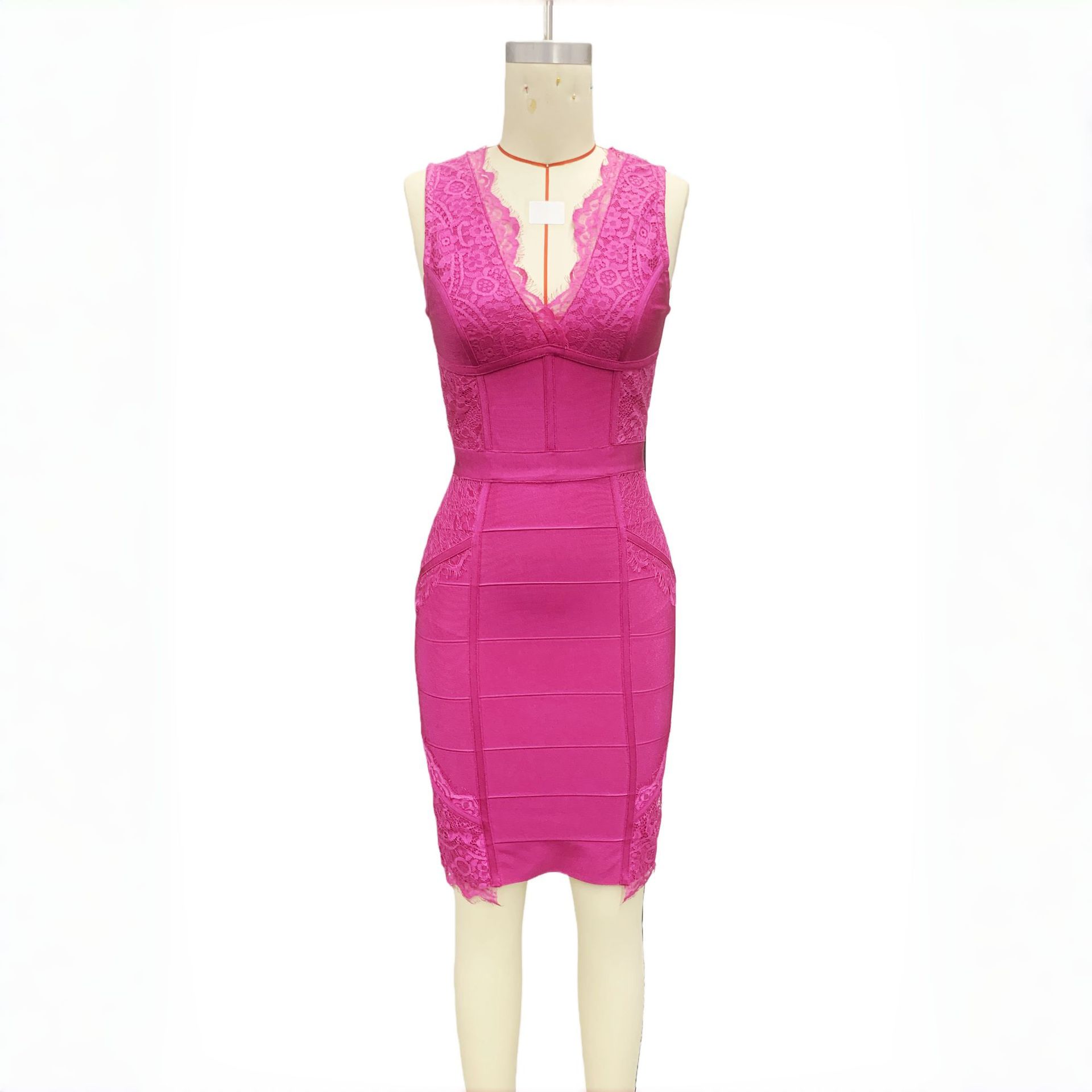 Deep-V Lace-Trimmed Solid-Color Patchwork Sexy Bandage Dress