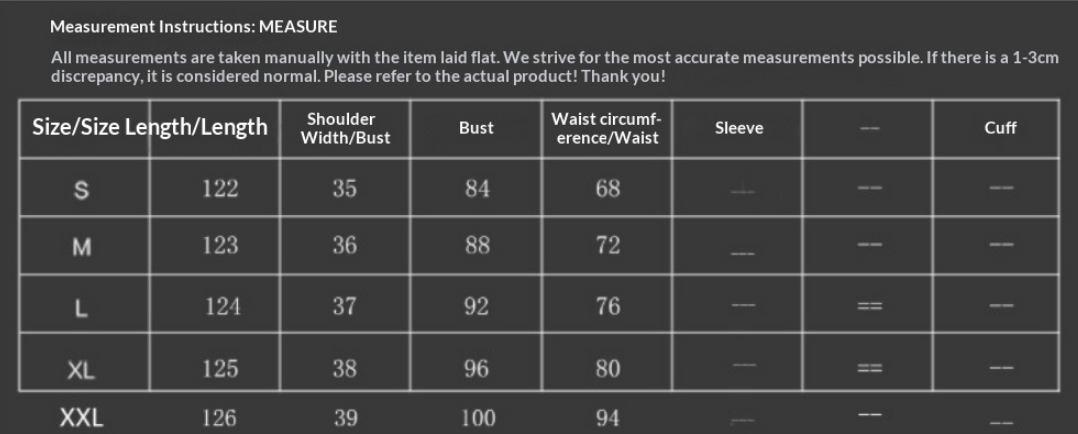 Note: 1. Asian sizes are 1 to 2 sizes smaller than European and American people. Choose the larger size if your size between two sizes. Please allow 2-3cm differences due to manual measurement. 2. Please check the size chart carefully before you buy the item, if you don't know how to choose size, please contact our customer service. 3.As you know, the different computers display colors differently, the color of the actual item may vary slightly from the following images.