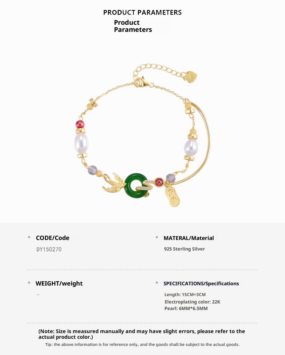 New S925 Sterling Silver Bracelet For Women Beaded Pearl Green Chalcedony Swallow